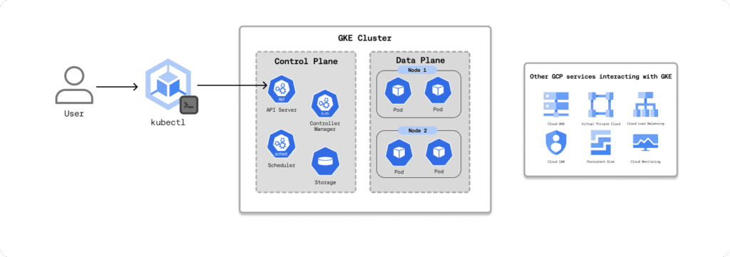 GKE is managed Kubernetes. Google runs the control plane while your workloads run on the data plane.