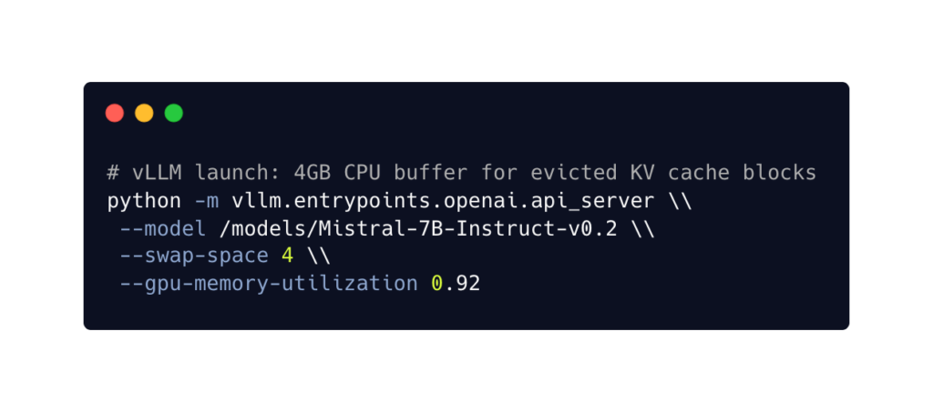 The --swap-space 4 means “allocate 4GB of CPU RAM as a landing zone for evicted attention context.” This is application-level swap: vLLM understands which KV blocks are hot and which are cold. It makes intelligent eviction decisions based on request activity. When those cold blocks are needed again (e.g., a user sends a follow-up message), vLLM copies them back from CPU RAM to VRAM.