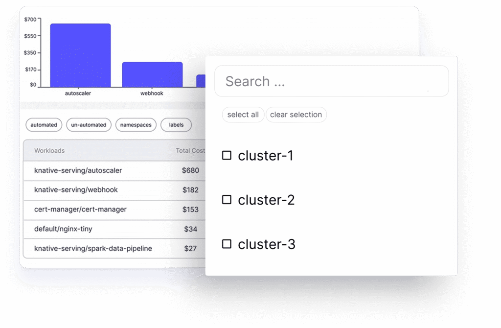 Get instant visibility into your actual Kubernetes costs, broken down by cluster, namespace, team, application, annotations, or labels. Attribute spend accurately at any level, for any stakeholder.